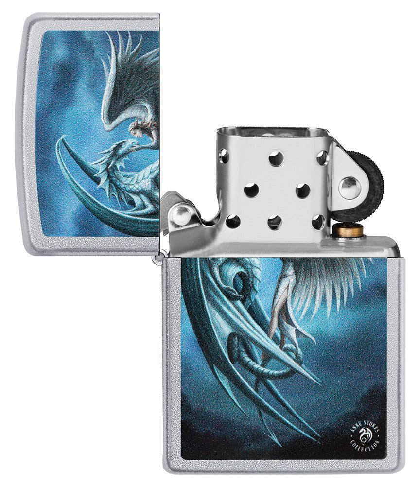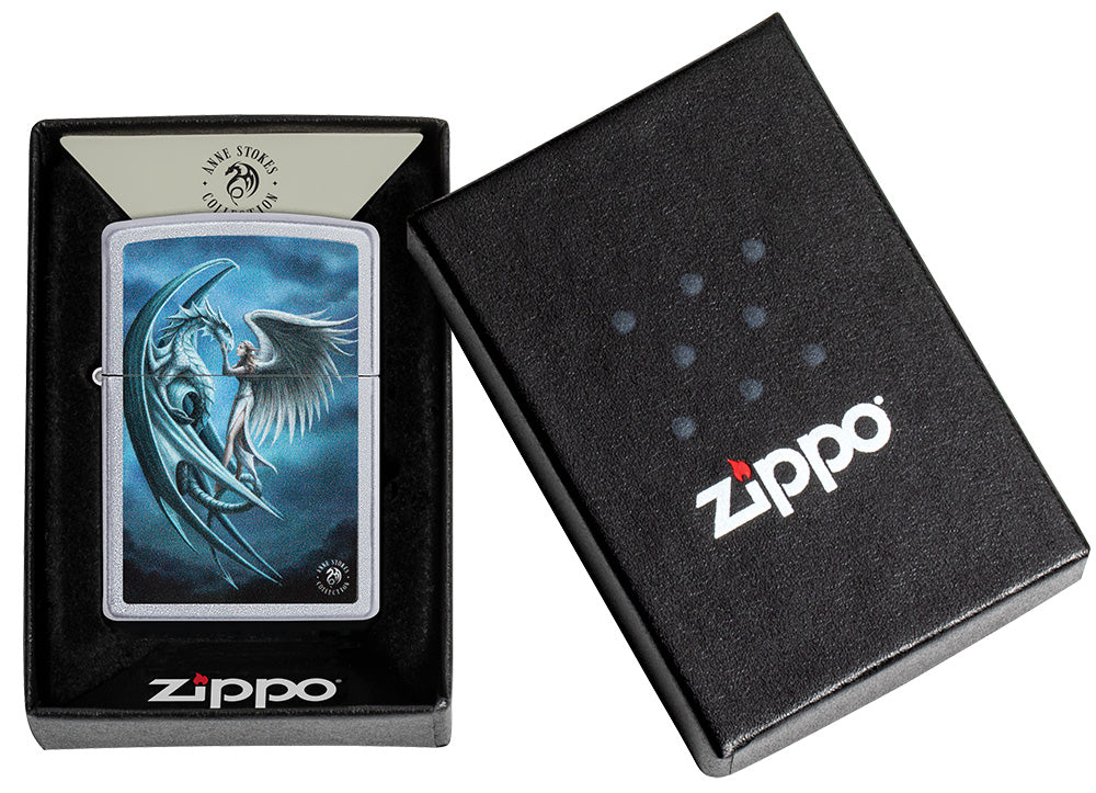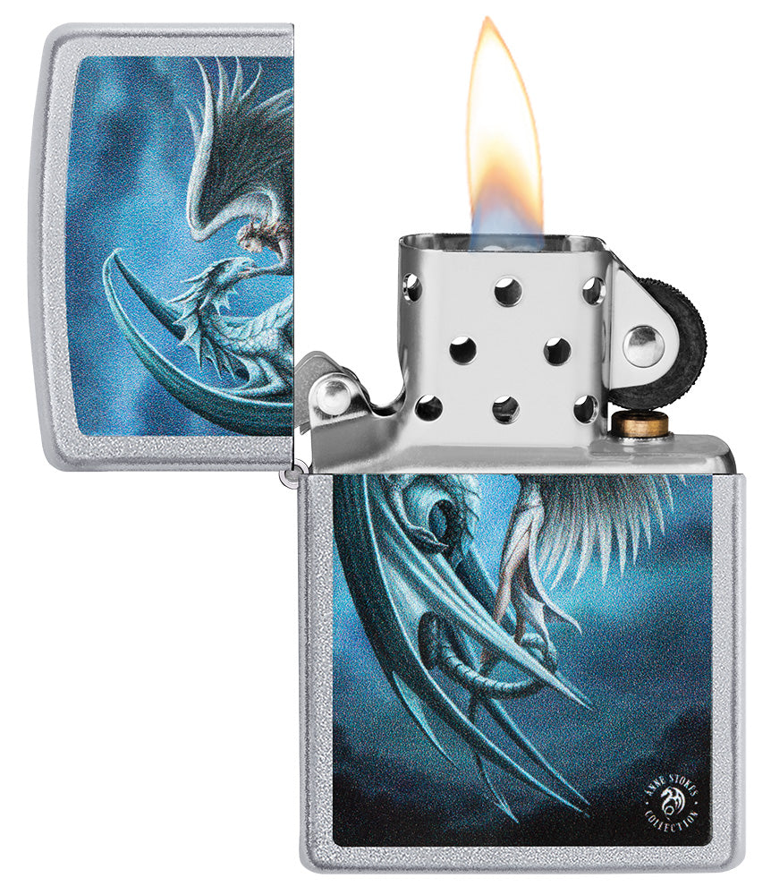 De Zippo aansteker met Satijn Chroom afwerking presenteert een fascinerend ontwerp met een majestueuze draak en een vrouw met engelenvleugels. De kleurrijke afbeelding toont de vrouw die teder het gezicht van de draak streelt terwijl ze elkaar liefdevol aanstaren. De combinatie van de glanzende satijnchromen afwerking en de levendige kleurenafbeelding geeft deze aansteker een unieke en esthetisch aangename uitstraling.