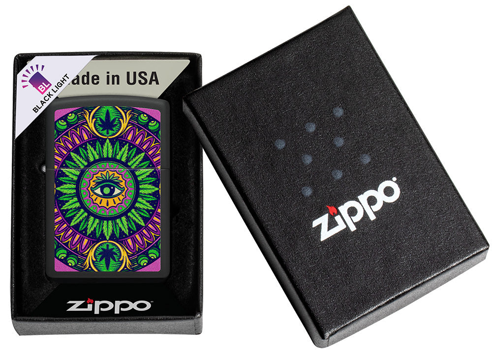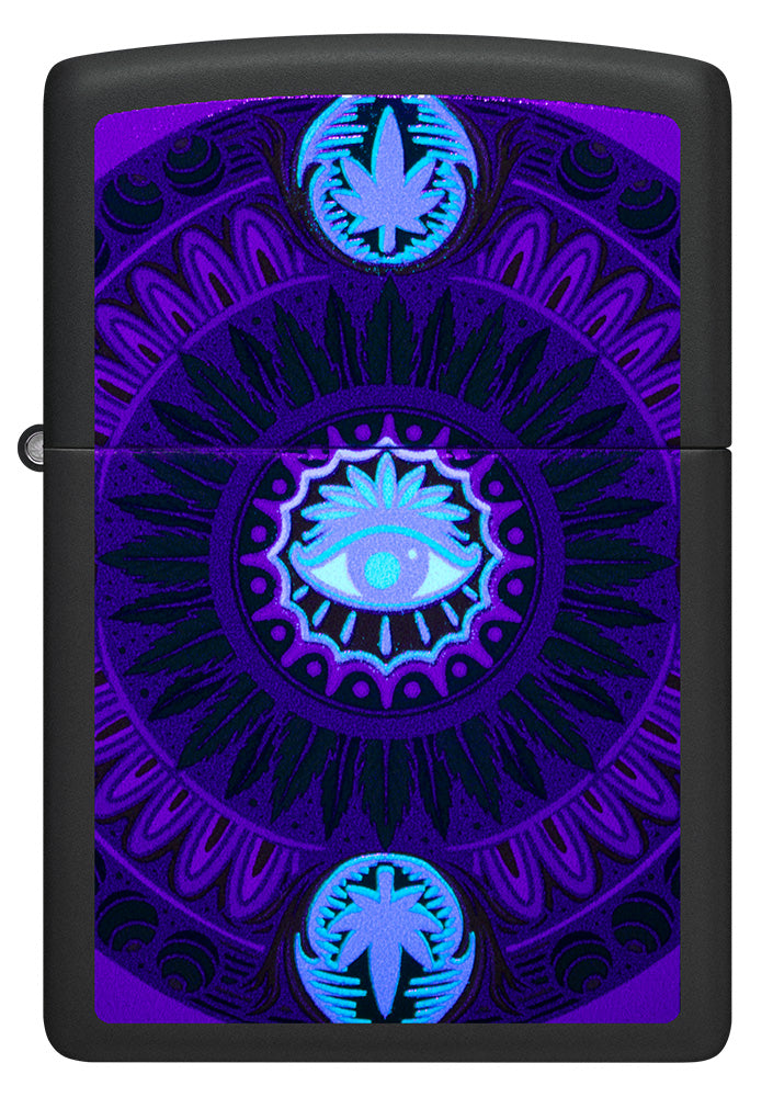 Een alziend oog houdt de wacht vanuit het midden van dit Color Image-design in de stijl van een mandala. Cannabisbladeren vormen een lauwerkrans en verankeren de boven- en onderkant van het design, dat afsteekt tegen de strakke Black Matte achtergrond. De aansteker is afgewerkt met ons eigen Black Light-proces en licht op in ultraviolet licht.