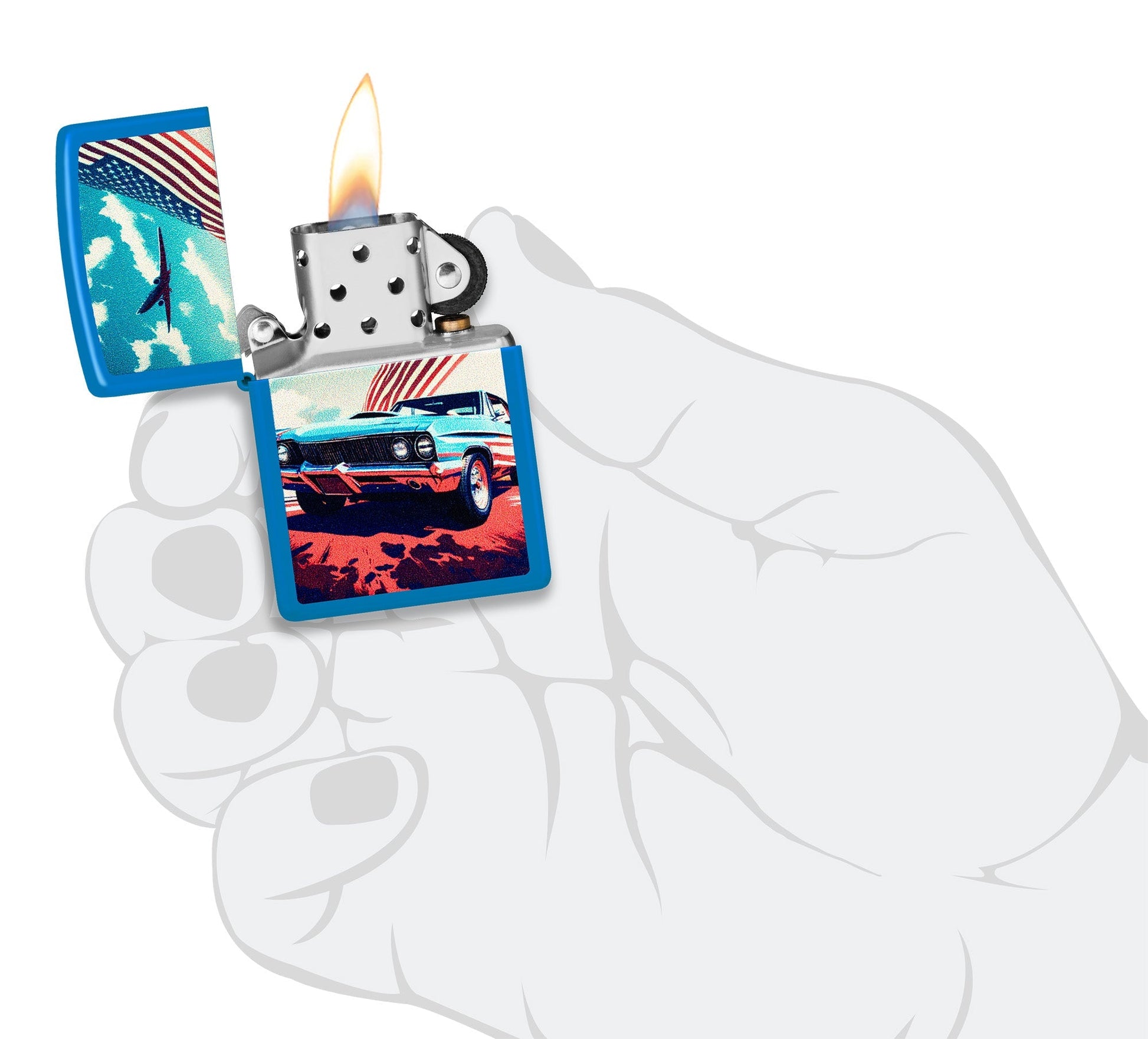 Deze klassieke Sky Blue Matte-aansteker is klaar voor je eerstvolgende roadtrip, met een felblauwe muscle car onder de Amerikaanse vlag, uitgevoerd in een sprankelend Color Image-design.