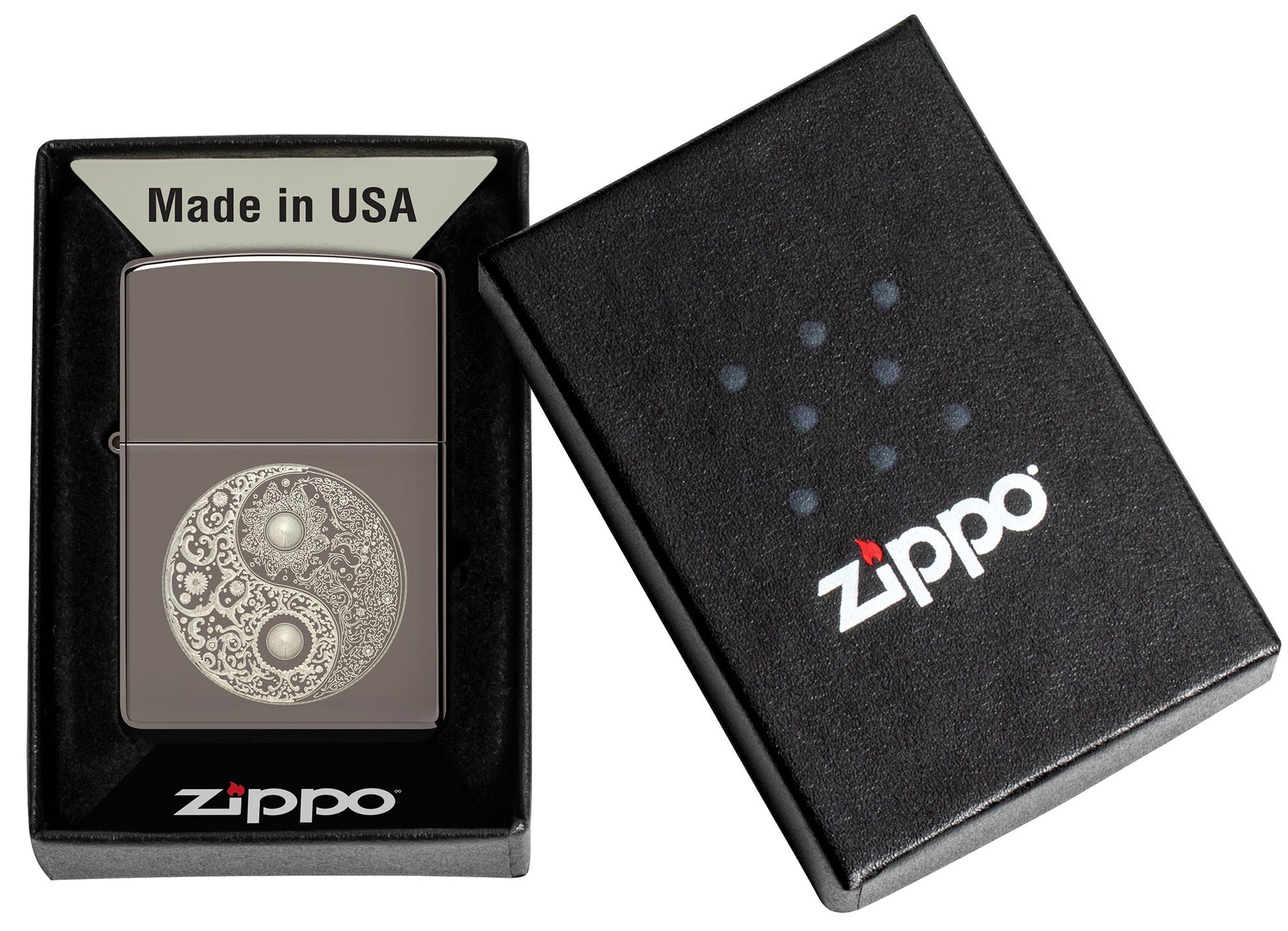 Voeg wat rust en evenwicht toe aan je collectie met deze klassieke Black Ice®-aansteker. De iconische yin-yangsymbolen, gevuld met fijn filigraan, zijn in perfecte harmonie afgebeeld in dit Laser Fancy Fill-design.