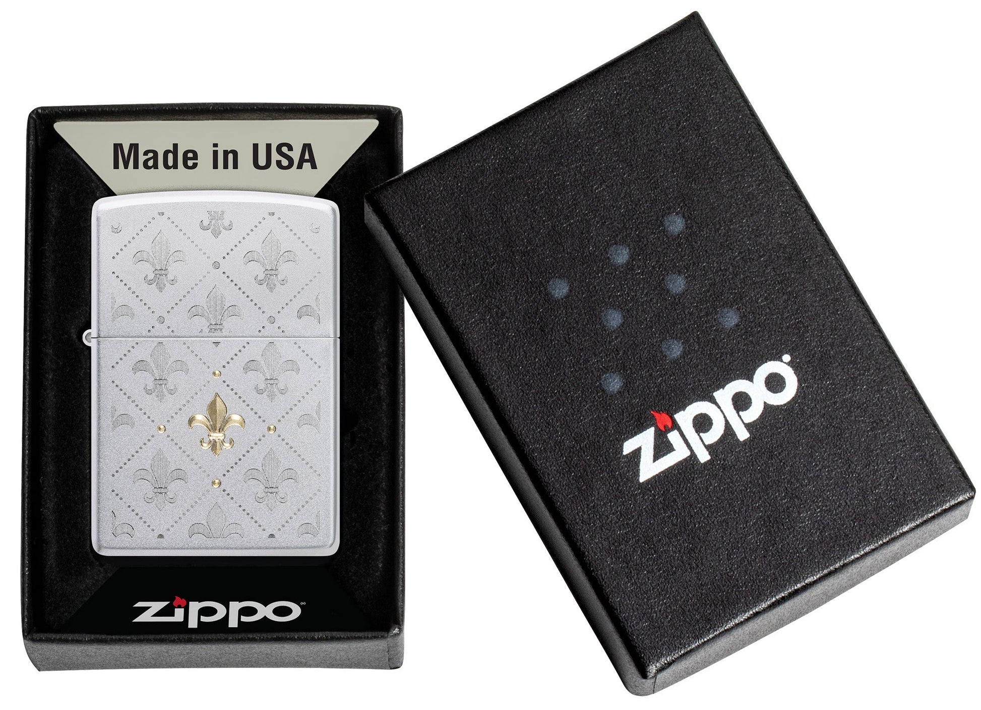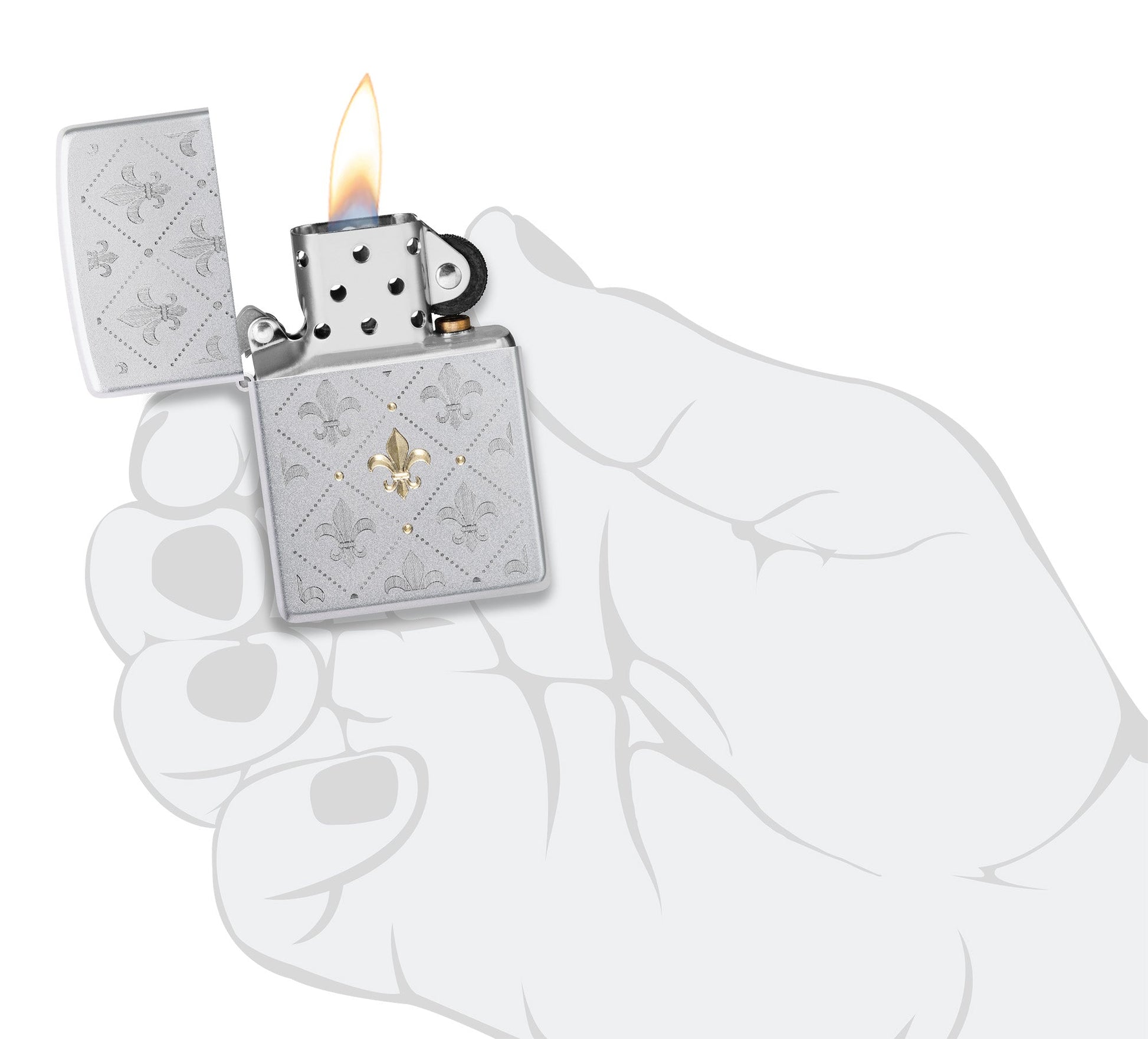 De fleur-de-lis, een iconisch symbool van eenheid en veerkracht, is afgebeeld in een gestileerd motief op deze klassieke Satin Chrome-aansteker. Het fraaie Auto Two-Tone-design zorgt voor een luxe contrast.