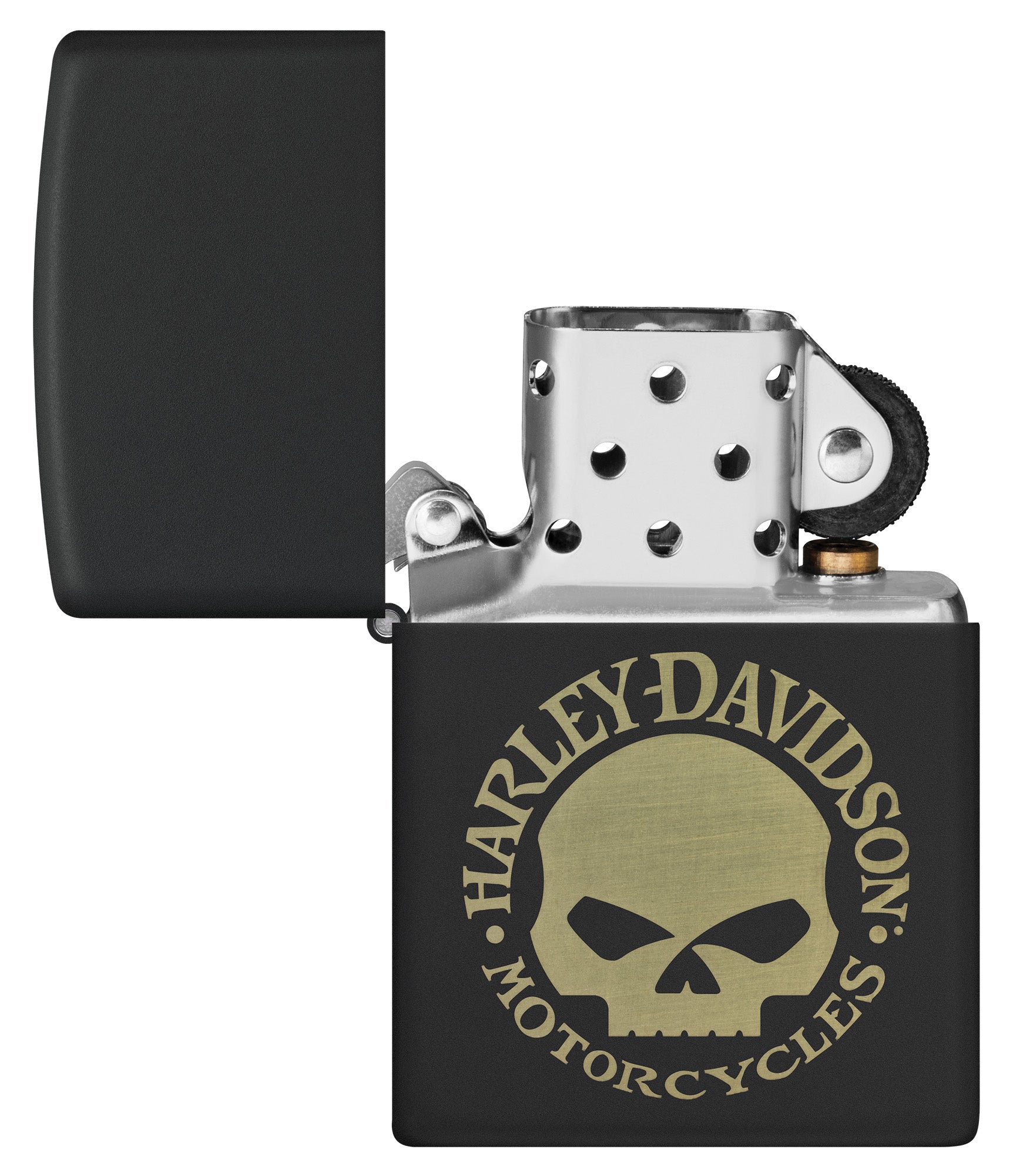 De iconische Willie G-schedel domineert het oppervlak van deze Black Matte-aansteker. Dit klassieke design, omcirkeld door het woordmerk van Harley-Davidson Motorcycles, is in warme messingtinten aangebracht door middel van onze Laser Engrave-techniek.