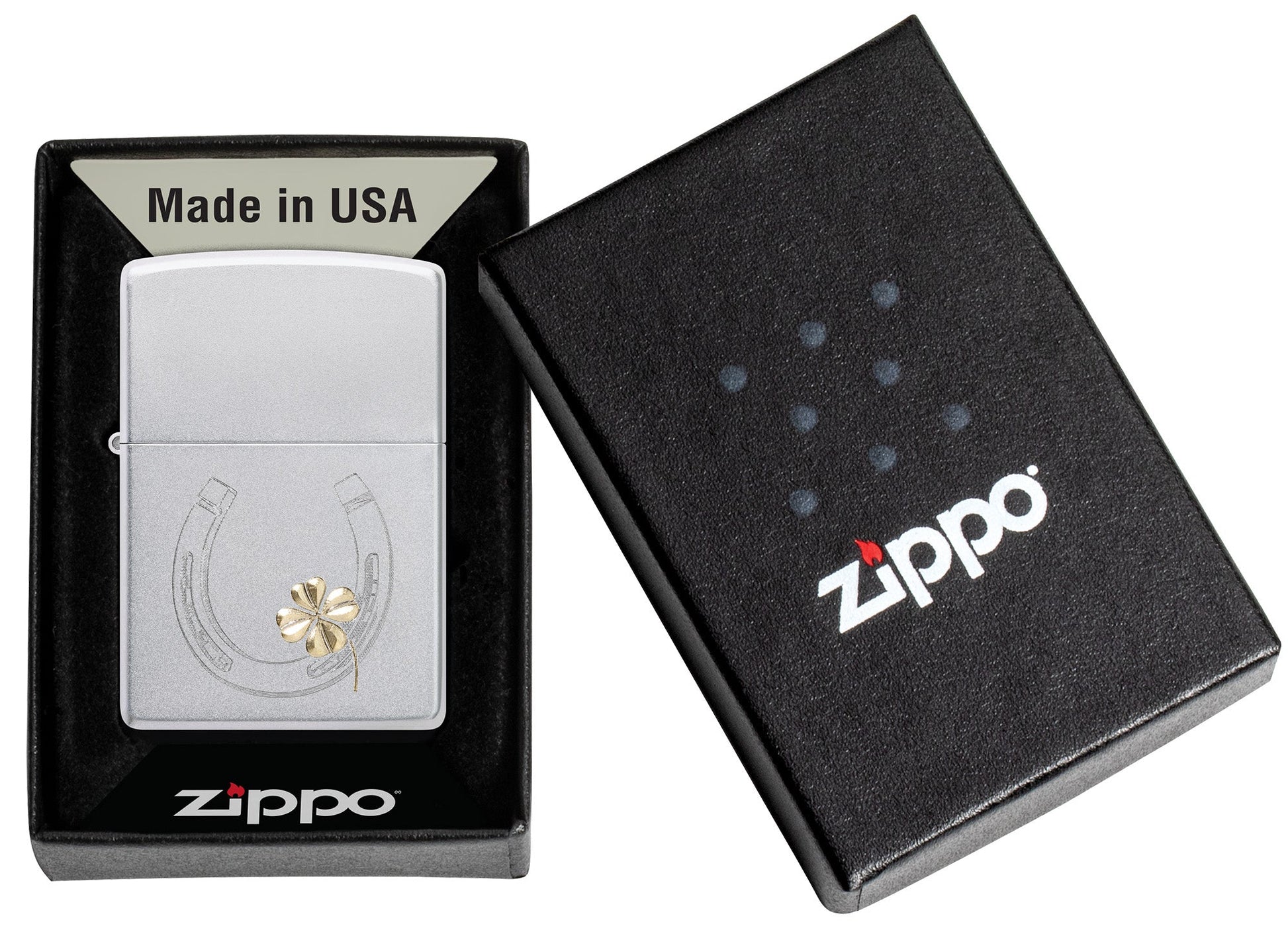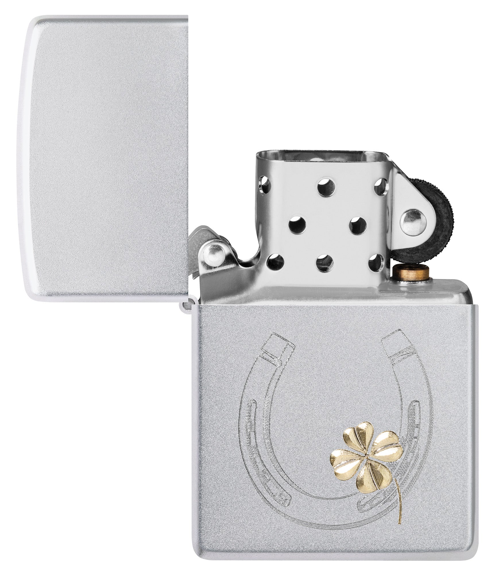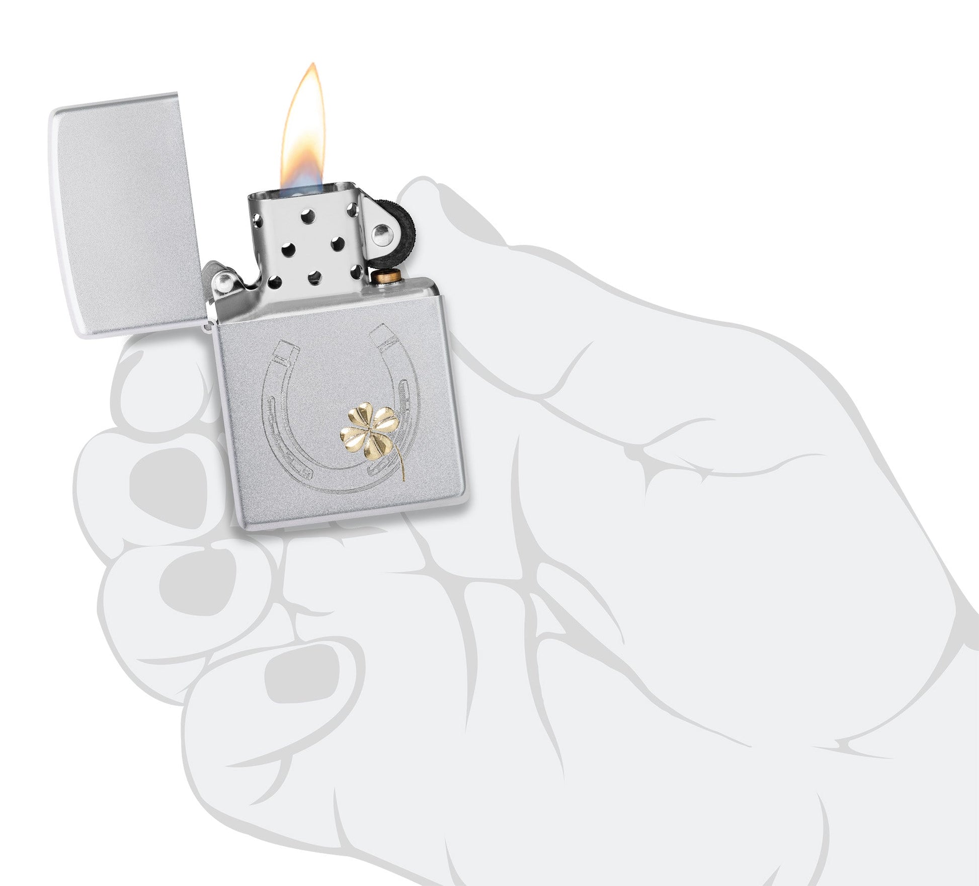 Deze klassieke Satin Chrome-aansteker brengt misschien wel geluk met zijn Auto Two-Tone-weergave van een hoefijzer met een klavertje vier.