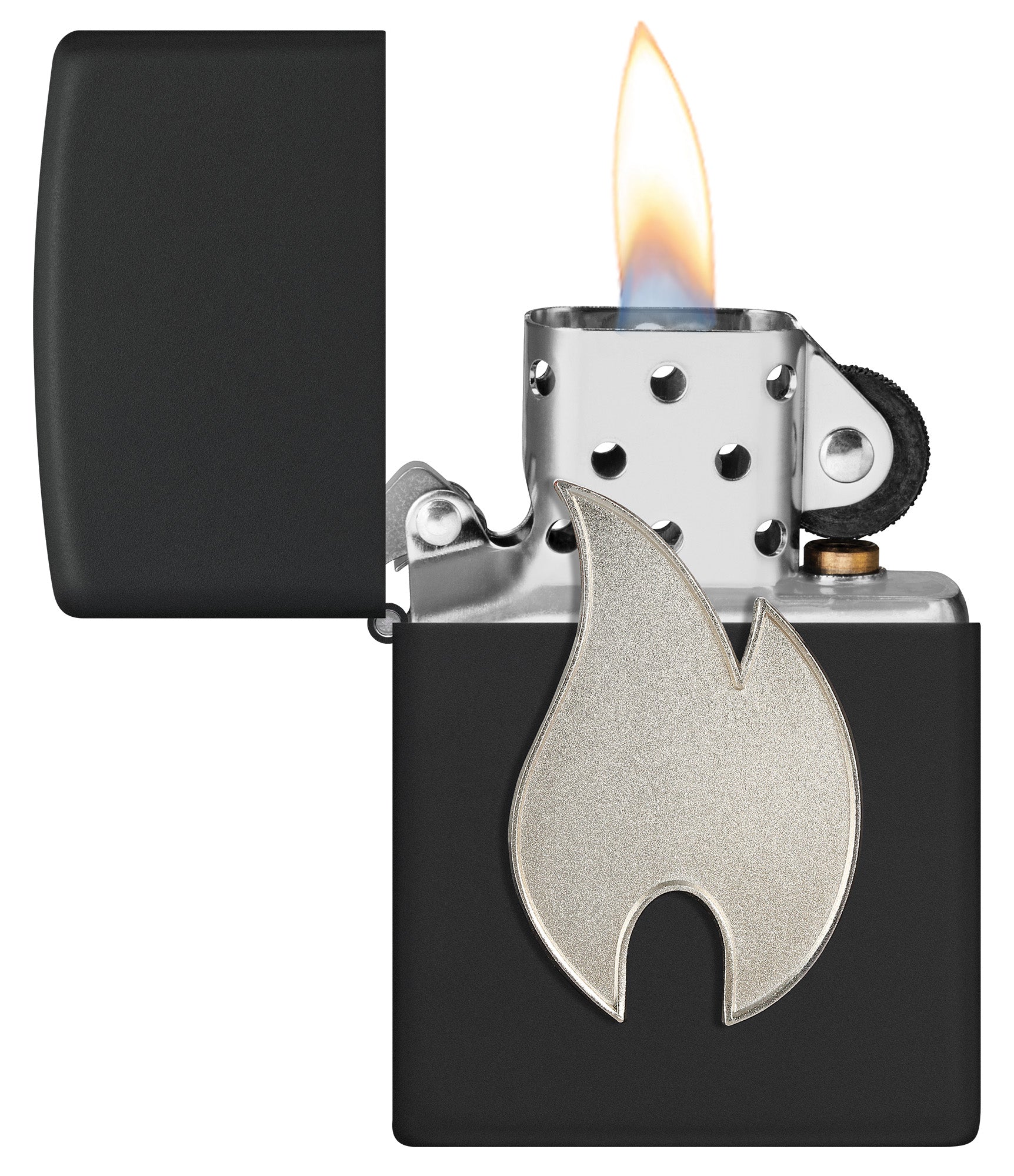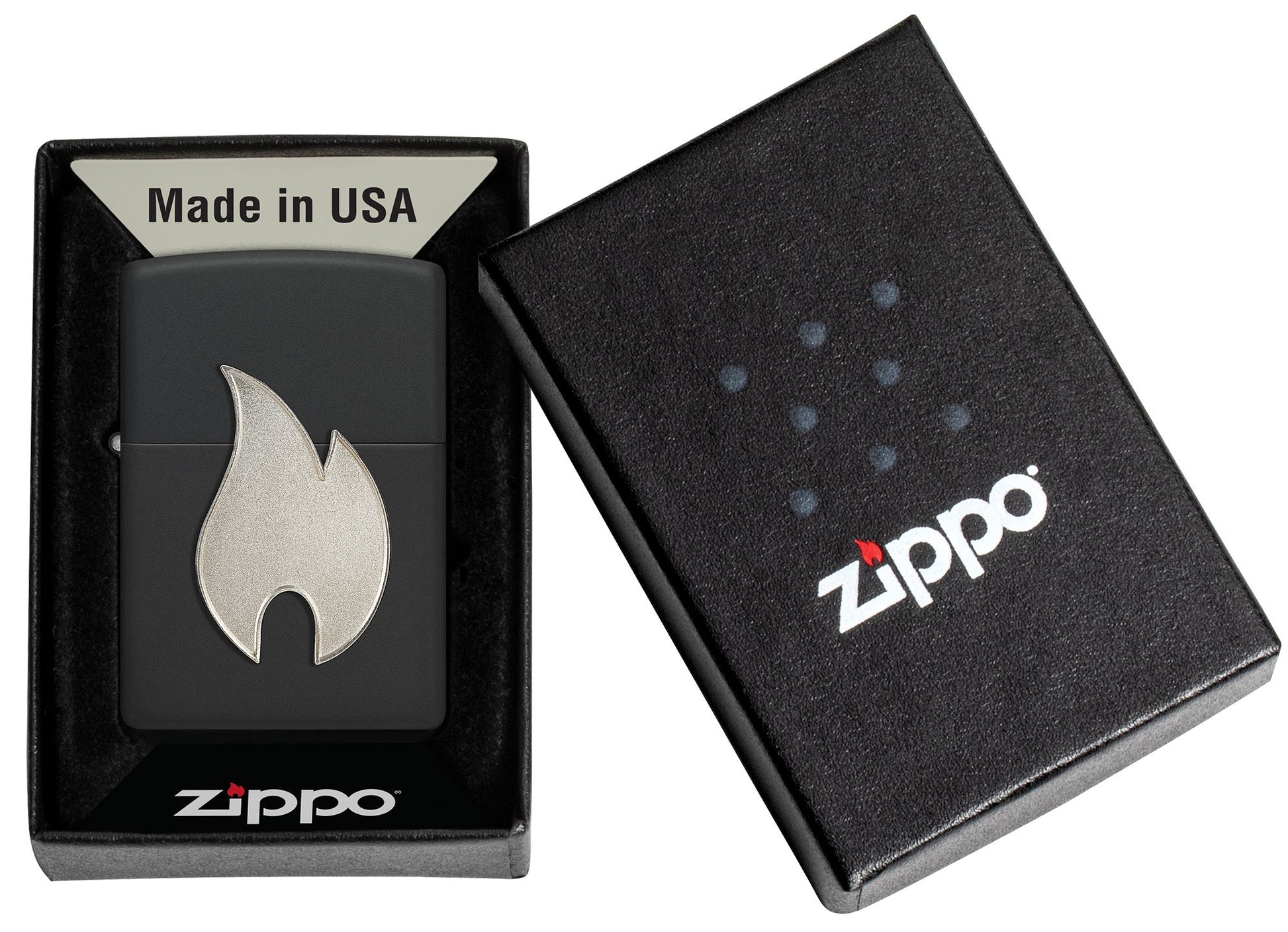 Deze klassieke Black Matte-aansteker heeft een zilverkleurig metalen embleem met het Zippo-vlamsymbool, dat op zijn plaats blijft wanneer de aansteker wordt opengeklapt.