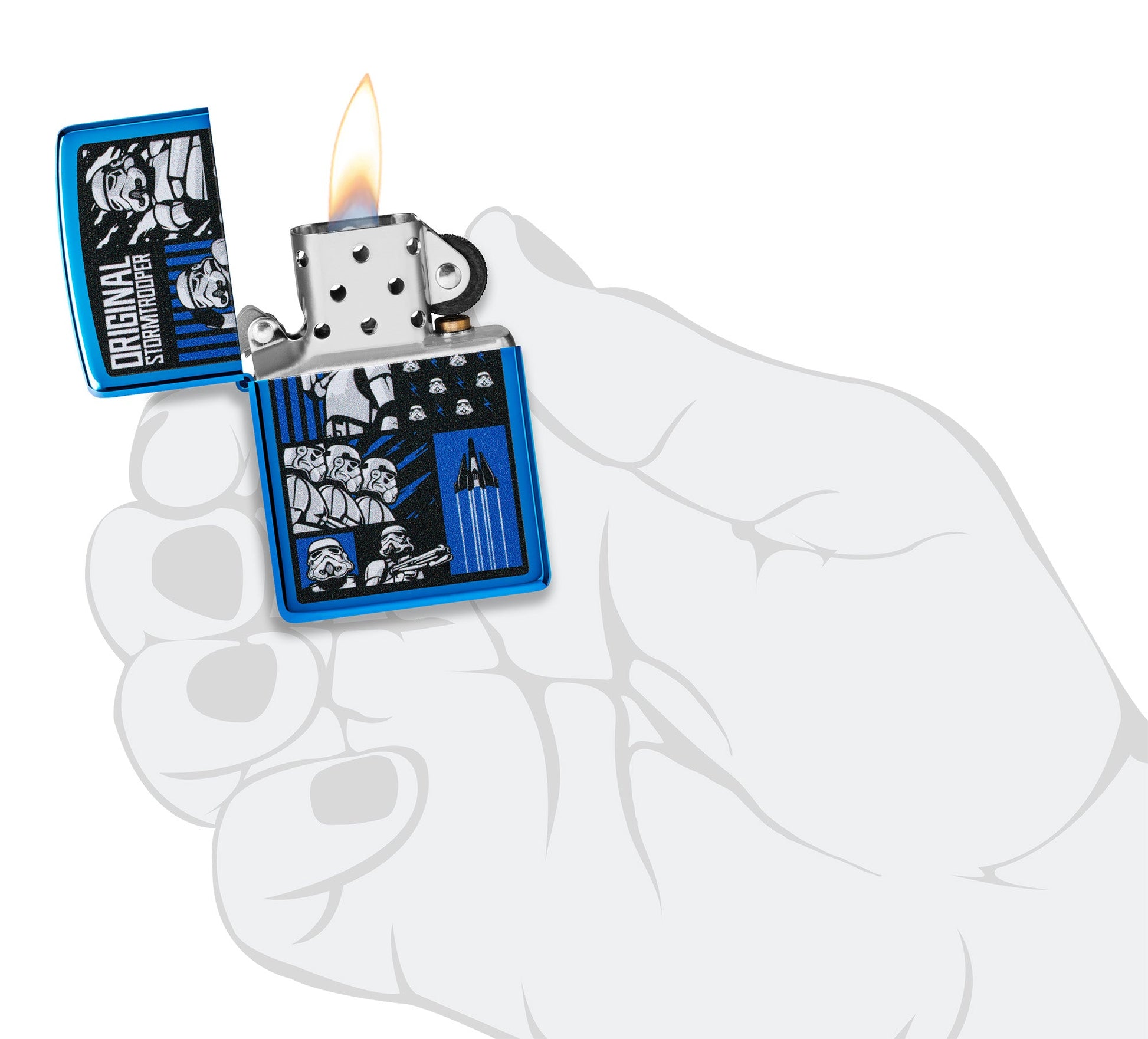 Dit ontwerp van Original Stormtrooper, misschien wel de meest herkenbare strijdmacht in het heelal, komt perfect tot zijn recht op deze klassieke High Polish Blue-aansteker. Het Color Image-ontwerp toont een collage van de geliefde soldaten in een reeks meeslepende scènes.