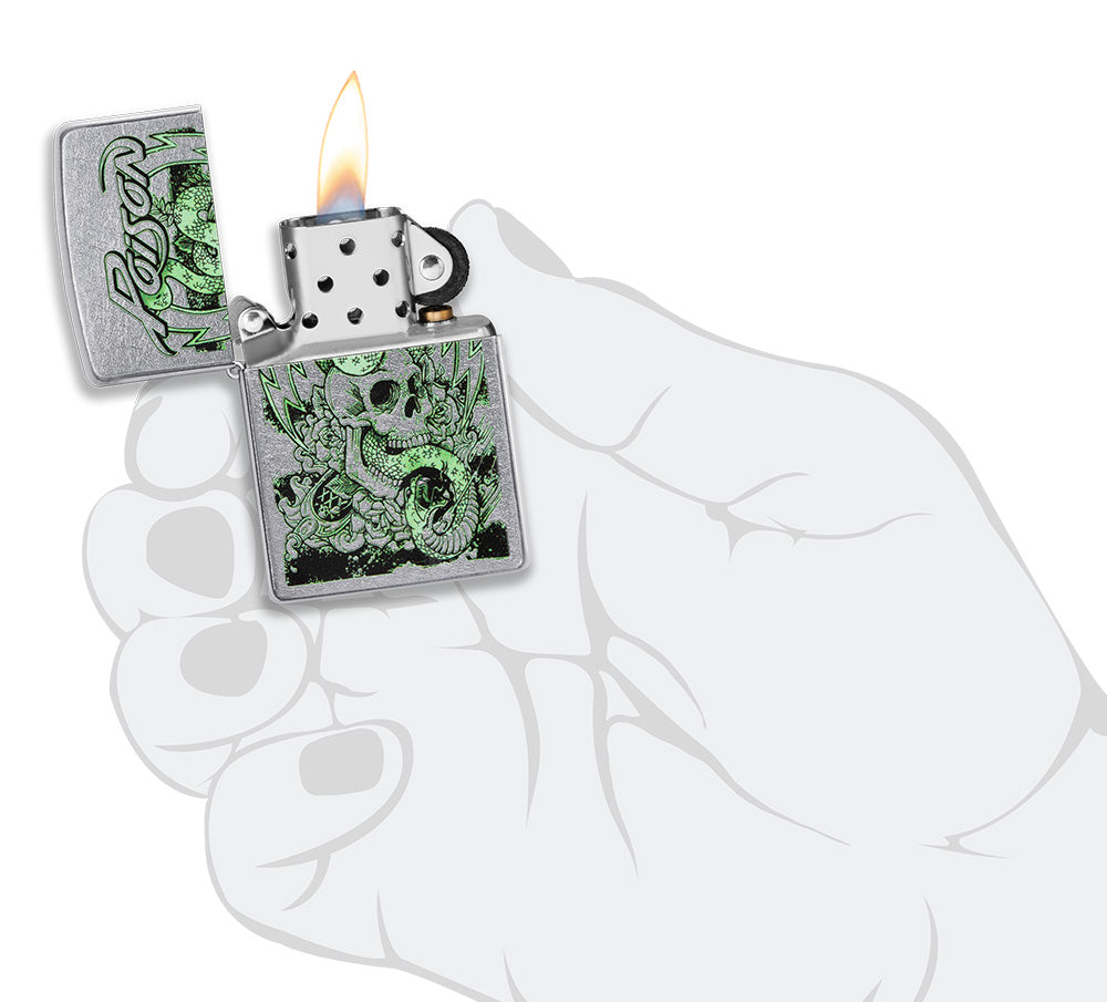 De Street Chrome afwerking geeft de aansteker een robuuste en toch moderne look. Het kleurrijke motief met de slang die door de schedel kronkelt, creëert een boeiend contrast en geeft de aansteker een mysterieuze esthetiek.